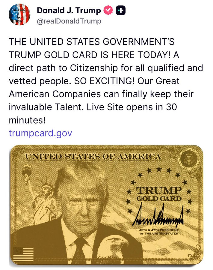 Le prĂ©sident prĂ©sente sa âTrump Gold Cardâ, le statut de rĂ©sident express⊠pour 1 million de dollars ! Une rĂ©volution migratoire taillĂ©e pour les ultra-riches.